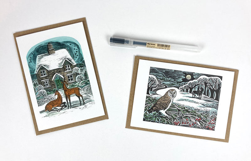 Set of Notecards - Christmas Cottage & Owl Flight by Angela Harding