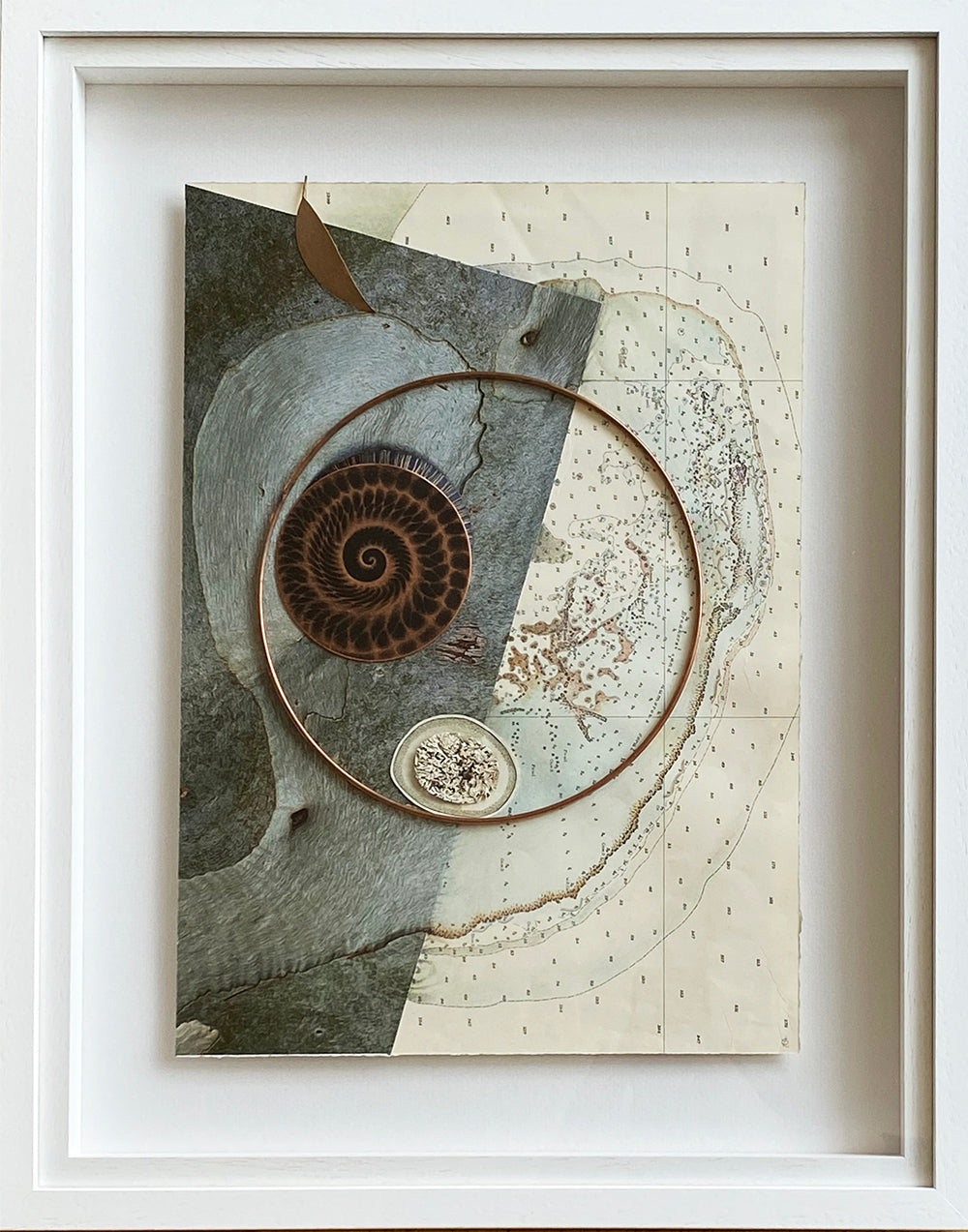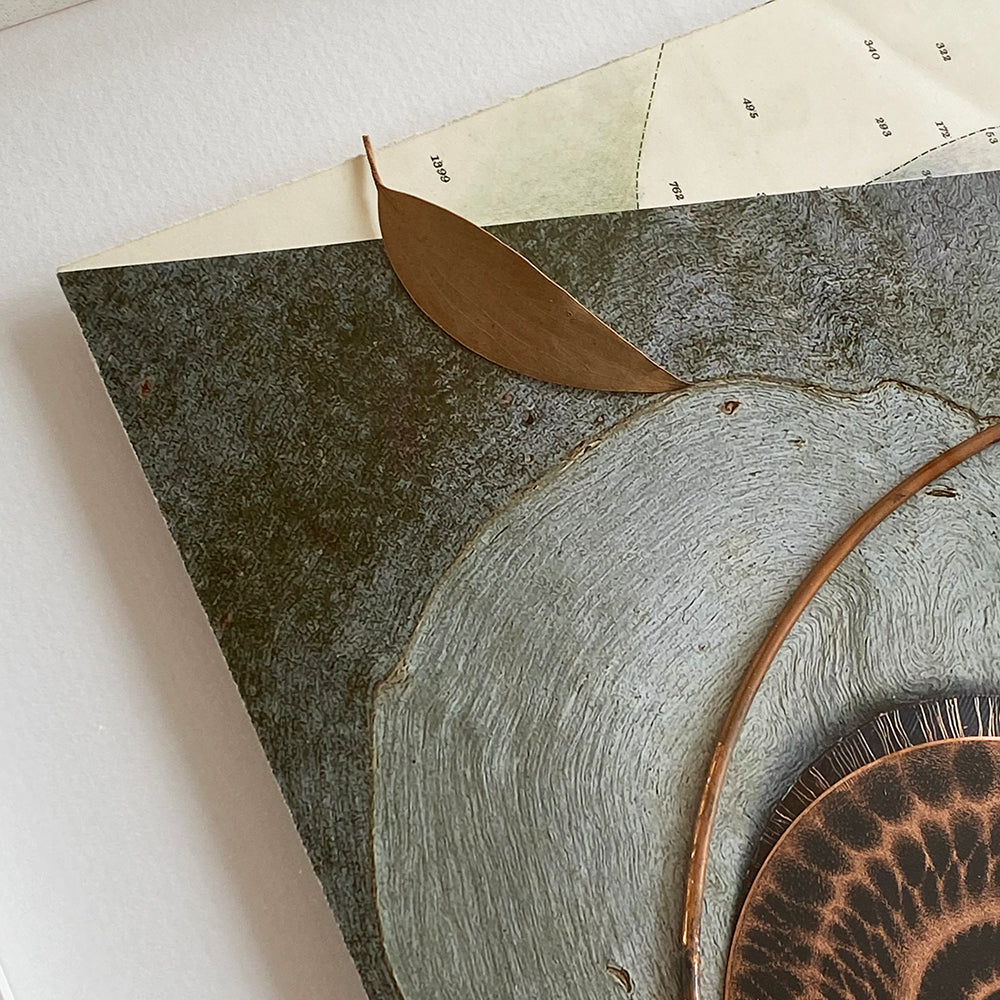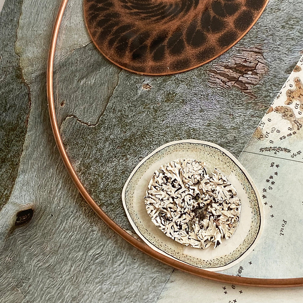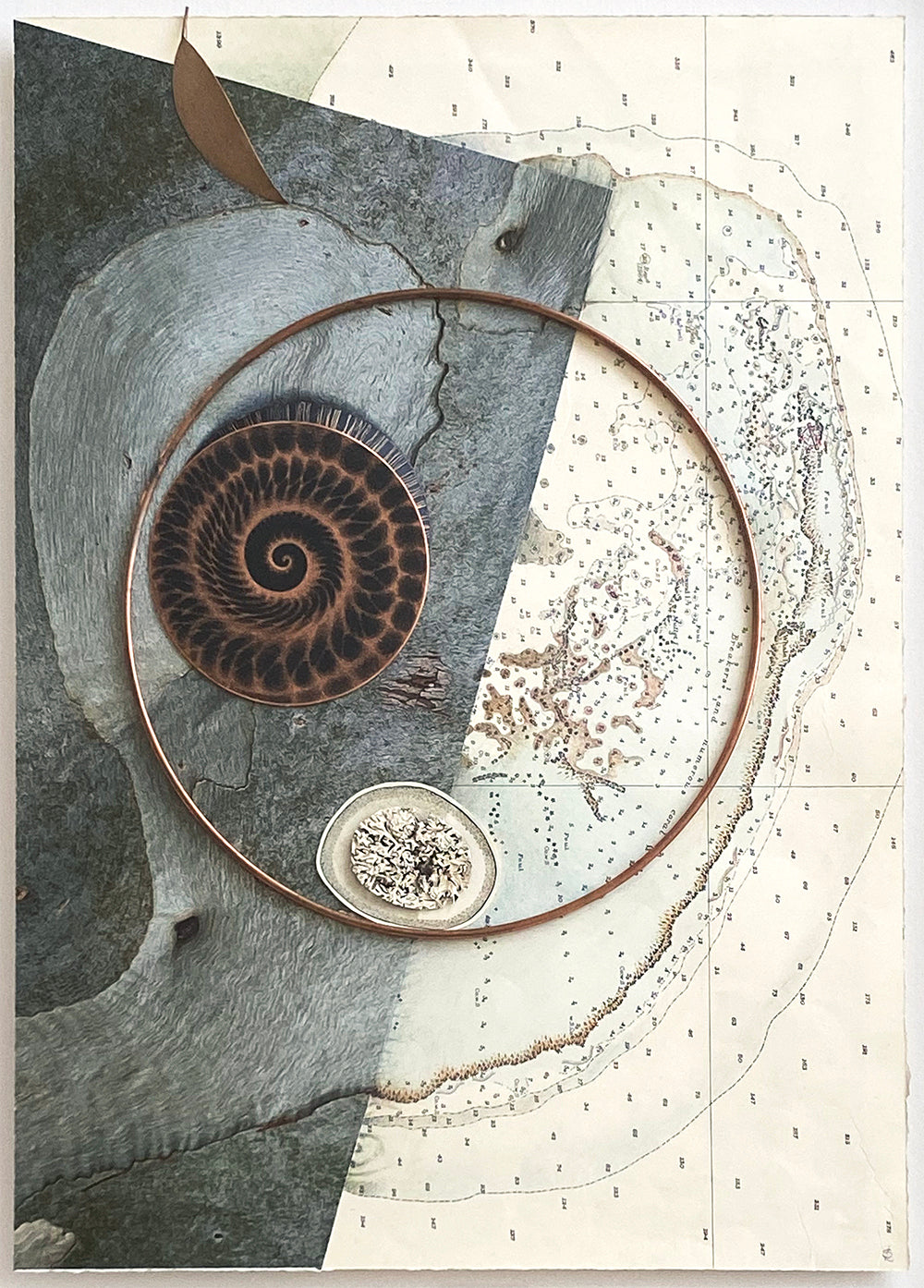 Unique collage with etching - copper, eucalyptus leaf, lichen & marine chart