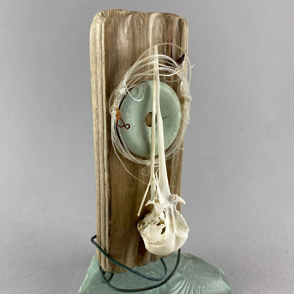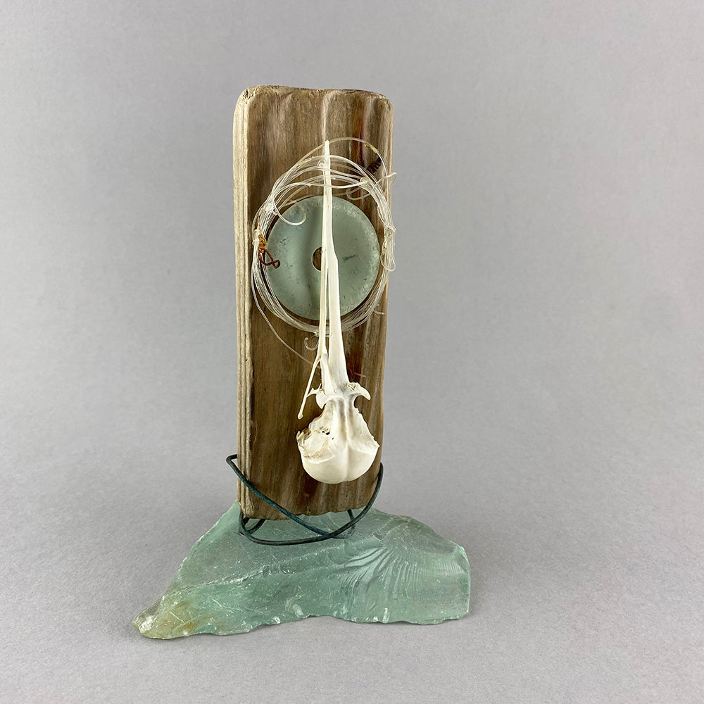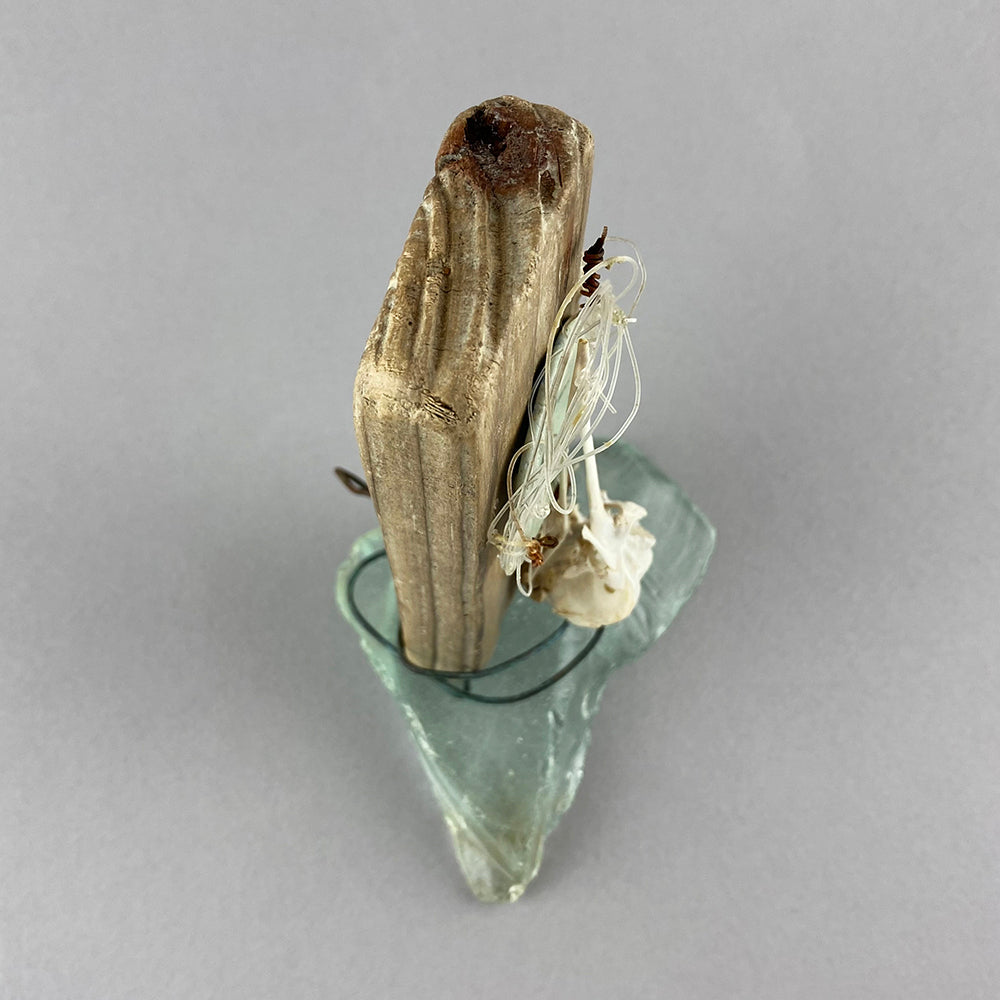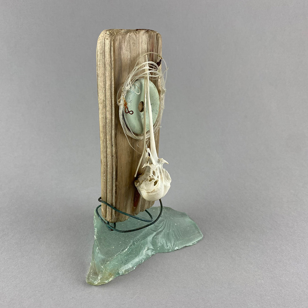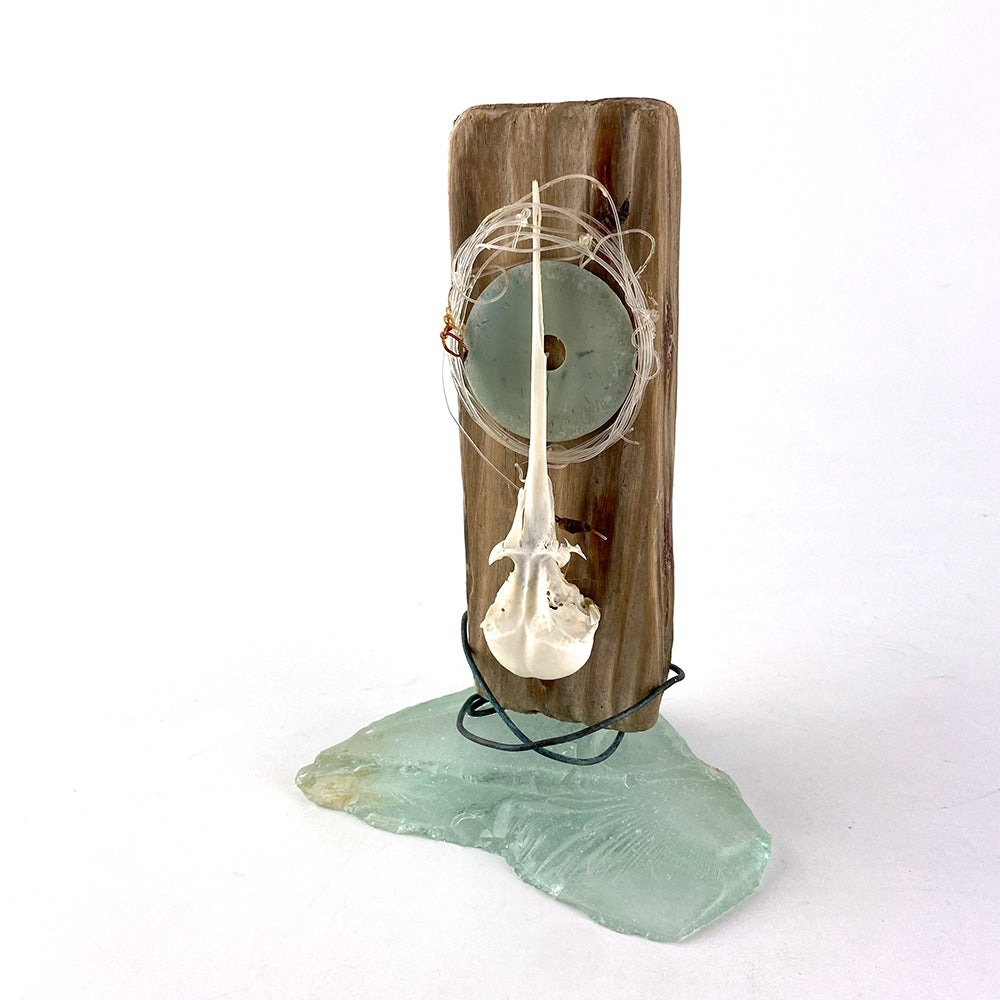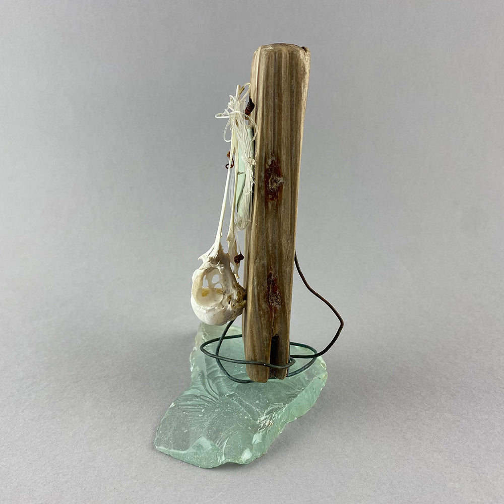 Unique construction - wood, skull, wire & found flotsam on glass shard base