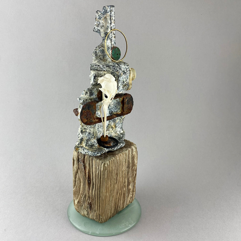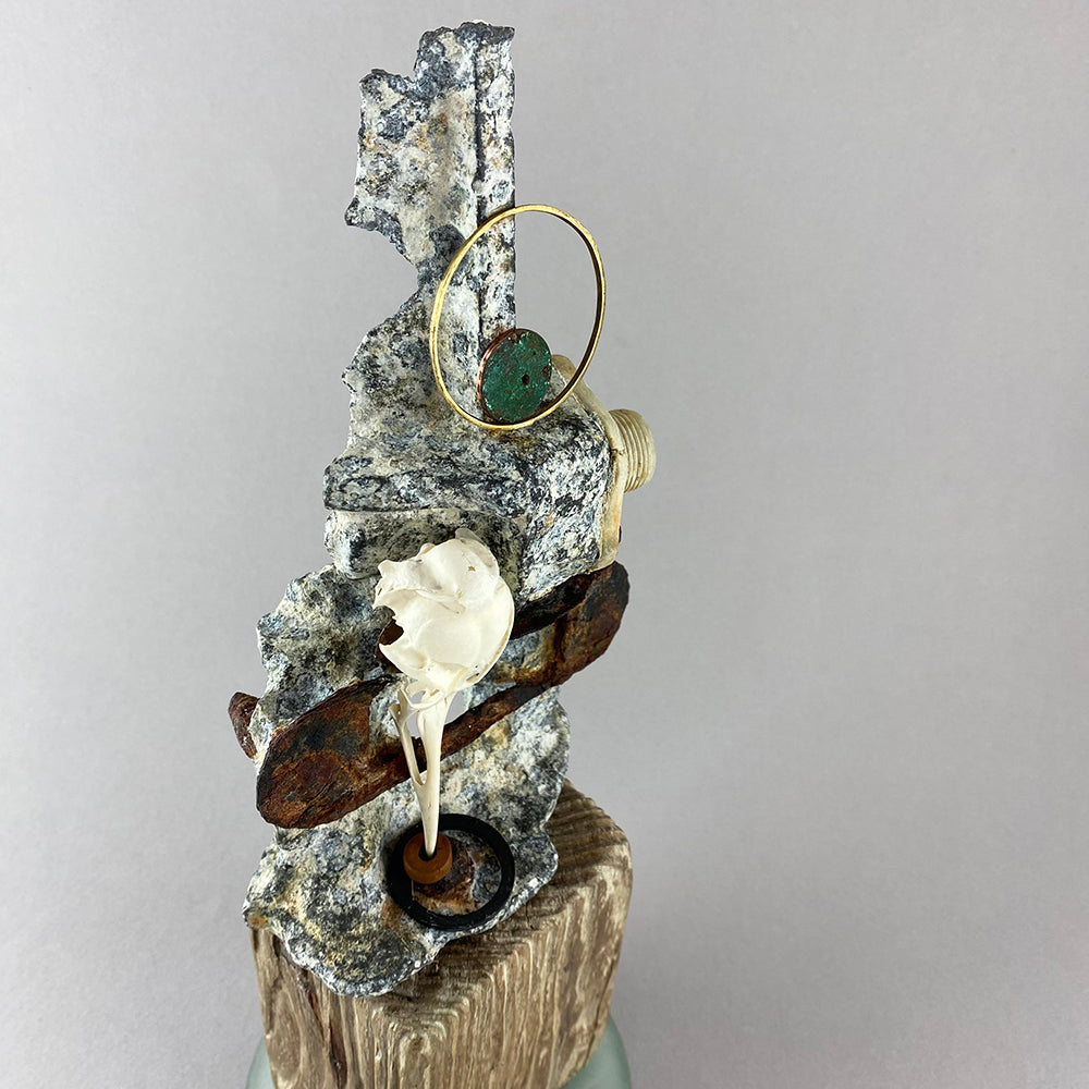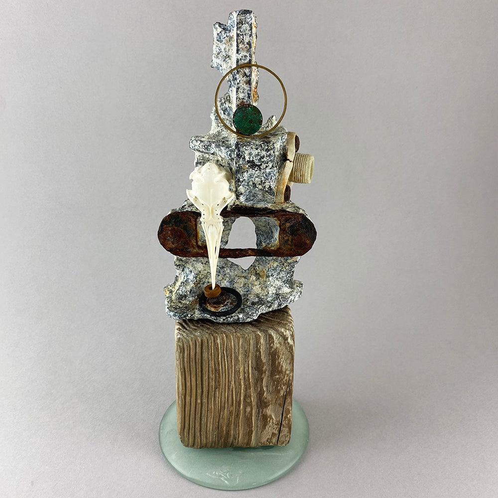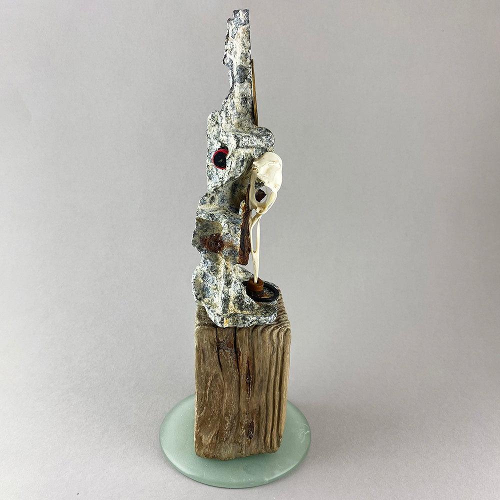 Unique construction - wood, coin, skull & found flotsam on frosted glass base