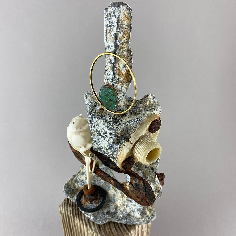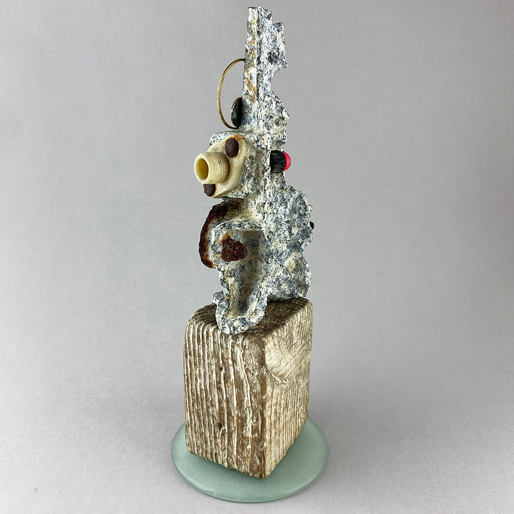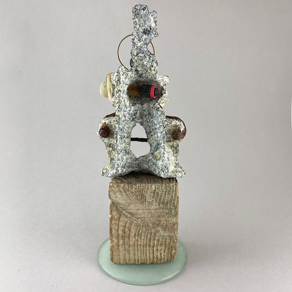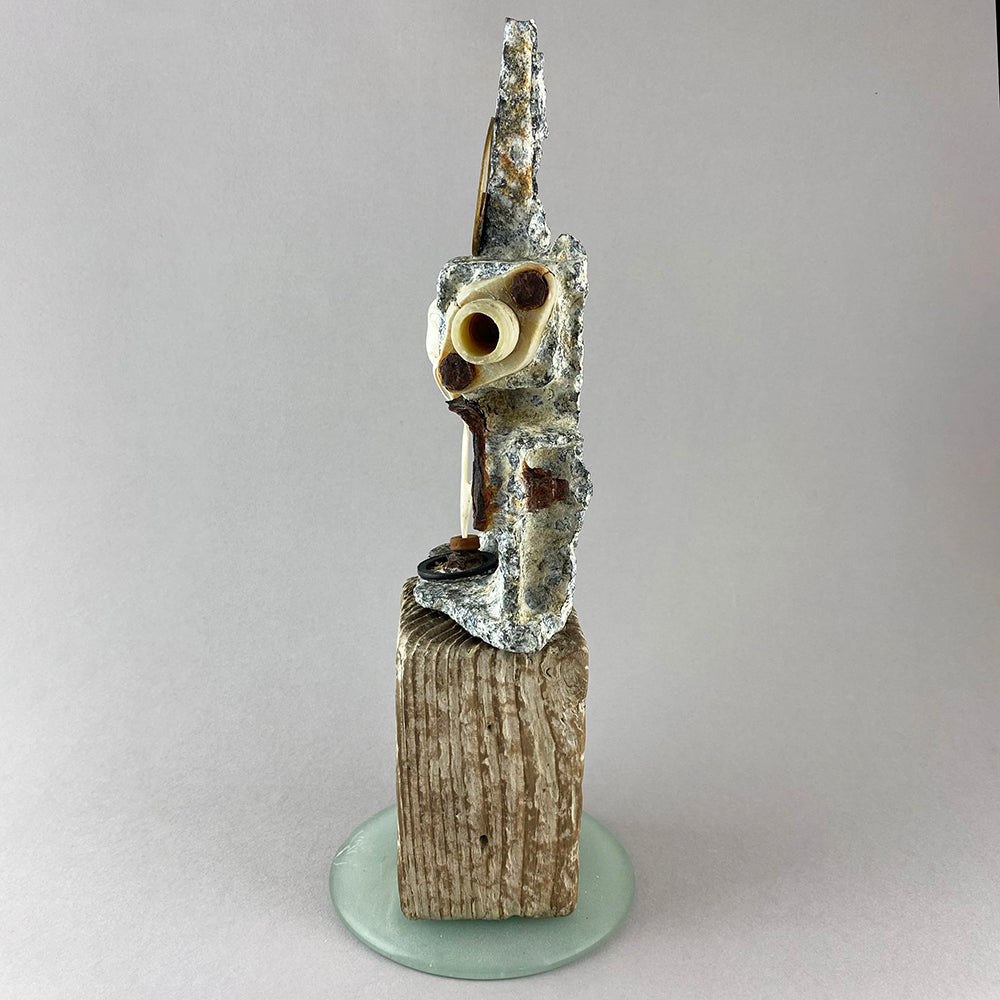 Unique construction - wood, coin, skull & found flotsam on frosted glass base