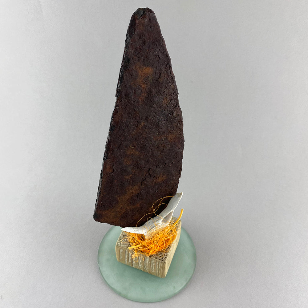 Unique construction - metal, bone, wood & found flotsam on frosted glass base